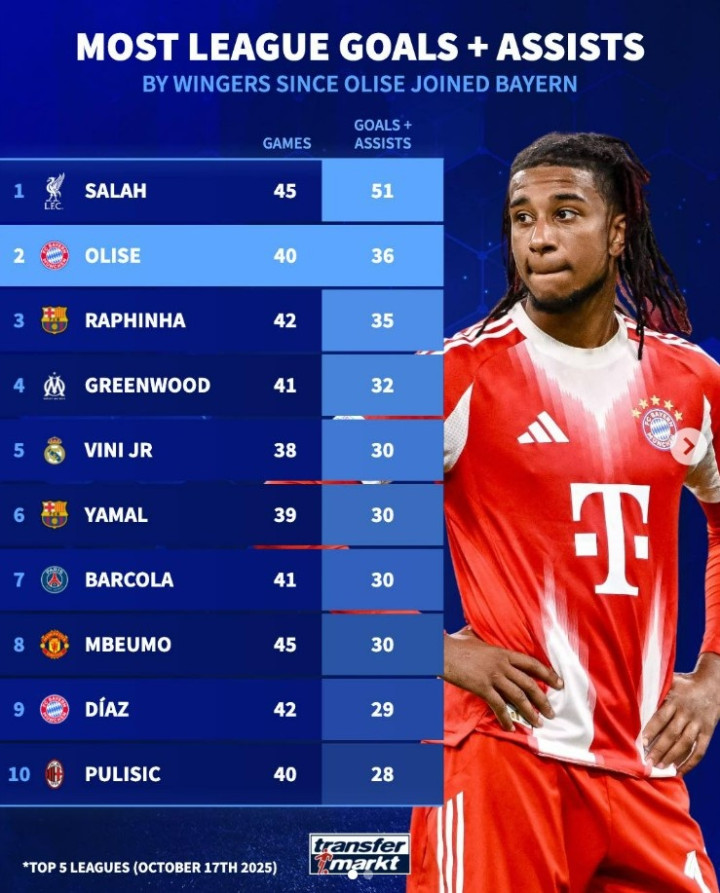自奥利塞加盟拜仁联赛直接参与36球, 边锋位置同期仅次于萨拉赫