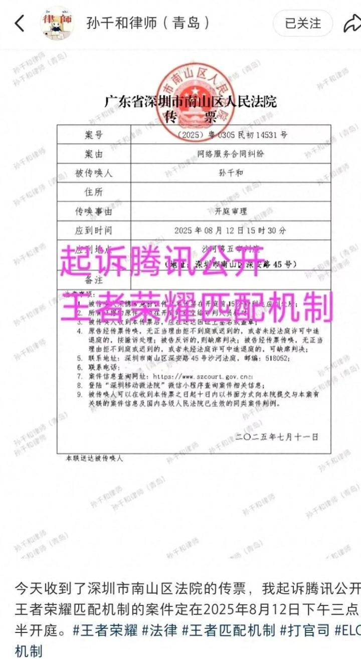起诉“王者荣耀”要求公开匹配机制案更改案由, 当事人称诉求一以贯之