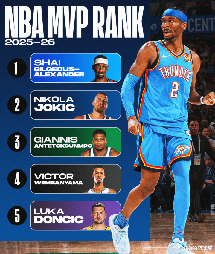 SGA所在的雷霆稳居西部第一,SGA的个人数据也十分出彩,那么他稳居MVP榜单第一就是板上钉钉的事情,今年很有希望连庄常规赛MVP。