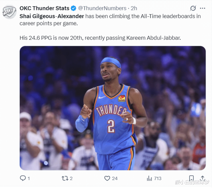 赛前雷霆媒体写道,SGA场均得分已经来到24.6分排在历史第20位超过了天勾贾巴尔。